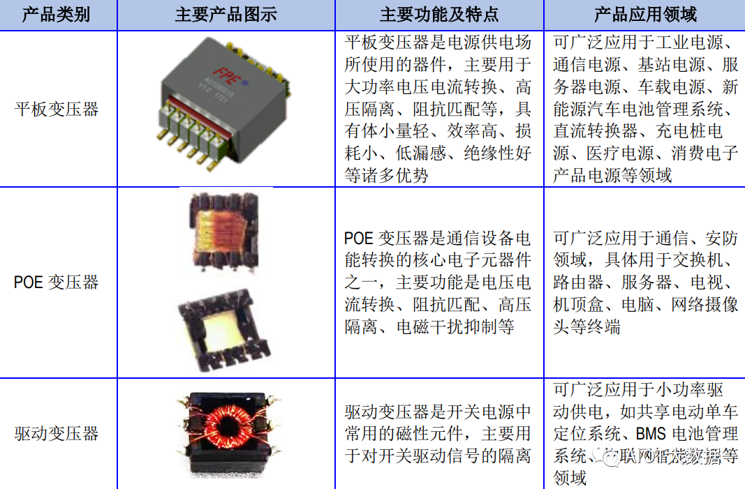 磁性元器件主要产品包括网络、片式电感、功率磁性元器件,已广泛用于网络通信领域,并在新能源汽车、工业电源等领域。网络是众多网络通信设备必需的基础元器件之一,在通信设备中起着传输信号、隔离高压、阻抗匹配、抑制电磁波干扰等作用。目前,公司网络包括DIP(DualIn-linePackage,双列直插封装)、SMD(SurfaceMountDevices,表面贴装器件)等子类。网络的主要功能是传输信号、隔离高压、阻抗匹配、抑制电磁波干扰等,是网络通讯设备的核心电子元器件之一。网络由塑胶外壳、磁芯、漆包线,通过特殊的绕制方法制成,其中由磁芯和漆包线组成基本的线圈,可广泛应用于网络通信领域,具体用于交换机、路由器、服务器、机顶盒、电脑、网络电视、网络摄像头等设备。片式电感作为网络通信、消费电子、安防设备、汽车电子等电子设备的基础电子元件,是利用电磁电路设计技术,搭配精密自动化绕线技术生产的新型SMD磁性元器件,采用成熟的SMT技术发展出来的全自动化产品。片式电感符合电子产品“短小轻薄”的发展趋势,网络通信、消费电子、安防设备、汽车电子等产业的快速发展对片式电感的需求量将大幅增长。片式电感利用电磁电路设计技术,搭配精密自动化绕线技术生产的新型SMD磁性元器件,采用成熟的SMT技术发展出来的全自动化产品。主要用于筛选信号、过滤噪声、稳定电流及抑制电磁波干扰等。可广泛应用于网络通信、消费电子、安防设备等领域,具体用于路由器、服务器、网络摄像头、平板电脑、网络电视等设备。功率磁性元器件是电源装置的基础元器件之一,在电子电路中起着电压变换、能量转移、储能滤波、隔离高压或筛选信号、稳定电流及抑制电磁波干扰的作用。磁性元器件是实现电能和磁能相互转换的电子元器件,属于电子元器件行业领域的重要分支,是保证电器电子设备稳定工作的重要基础元器件。磁性元器件应用领域非常广泛,覆盖了网络通信、汽车电子、工业电源、消费电子、安防设备、智能家居、医疗电子等众多领域。磁性元器件品类众多,每种产品的型号和规格均存在一定差异。得益于应用领域的广泛性,磁性元器件未来具有良好的市场发展空间。在网络通信领域,磁性元器件主要应用于路由器、交换机、服务器、机顶盒、光纤收发器、网络电视、终端通信设备等网络通信产品;新能源汽车领域,新能源汽车配置电池、电机、电控等电子系统,车载电子产品应用场景较传统燃油车更加广阔,新能源汽车电子磁性元器件使用率更高,同时新能源汽车充电桩也会涉及磁性元器件的应用;在工业电源领域,通信电源、服务器电源、电力电源、医疗电源等电源设备都需要磁性元器件;在消费电子领域,智能手机、平板电脑、笔记本电脑等消费电子产品的电源模块、充电器都会涉及磁性元器件的应用。磁性元器件是电子设备的基础元器件之一,在电子元器件产业中具有重要的地位,属于电子设备制造产业链的上游,其市场需求及发展趋势与下游应用领域的发展紧密相关。磁性元器件下游应用领域包括网络通信、新能源汽车、工业电源、安防设备、消费电子等,下游产品需求的快速增长直接带动了市场对磁性元器件的需求。全球网络通信设备市场规模整体呈增长趋势,而我国网络通信设备市场增速更快。网络通信设备是用于网络连接、维持数据传输的设备,属于信息化建设所需的基础架构产品,涵盖路由器、交换机、服务器、机顶盒、5G基站等设备。网络通信设备是磁性元器件应用的重点领域。在高质量网络连接需求迫切、Wi-Fi6技术普及与应用、国家大力推行以5G和千兆光网为代表的“双千兆网络”的背景下,路由器设备将迎来新一轮迭代更新,路由器中实现网络信号传输功能的核心组件就是网络,路由器的更新换代将极大增加对磁性元器件的市场需求,推动磁性元器件的发展与技术迭代升级。Wi-Fi6路由器升级改造成为必然发展趋势,具体情况如下:第一,随着网络质量要求的不断提高,以及物联网、大数据等技术驱动联网设备的持续增加,传统Wi-Fi性能在面对新兴应用场景下显得捉襟见肘。第二,教育、医疗、制造、政府、金融等都在加快数字化转型的步伐,远程办公、线上教育、视频会议、智慧医疗等应用场景快速发展,使用网络的终端设备数量持续攀升,迫切需要强大的网络支撑达到数字通讯顺畅的用户体验,也促使Wi-Fi6技术强势发展,带动了路由器产品的升级改造。第三,我国政府大力推动5G和千兆光网建设,推动移动宽带和固定宽带双双进入千兆时代。随着千兆网络的渗透,AP端口(AccessPoint)设备将升级替代,Wi-Fi6路由器能够发挥千兆网络的速度。我国网络基础设施建设提速,会带来路由器大范围的升级换代,从而大幅增加Wi-Fi6路由器的采购需求。根据IDC数据,2017年至2020年,我国路由器市场规模由31.9亿美元增长到37.6亿美元,预计到2024年市场规模将较2020年增长23.67%,达到46.5亿美元。在5G叠加云计算、大数据、物联网、人工智能等新一代信息技术的大背景下,高清视频、VR/AR、智能交通、智慧医疗、自动驾驶等领域的数据传输和存储量呈现爆炸式增长,数据中心作为数据存储和应用的关键基础设施,其重要性越发凸显。2020年3月4日召开的中央政治局常务委员会会议提出,加快5G网络、数据中心等新型基础设施建设速度,数据中