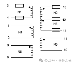 更加详细的说明:初级对初级的耐压为N1 to N4,N1 to N6,N4 to N6的耐压;次级对次级的耐压为(N2+N3)to N5 的耐压;初级对次级的耐压为(N1+N4+N6) to (N2+N3+N5) 的耐压。初级对磁芯的耐压是指N1/N4/N6 to 磁芯 的耐压,N2/N3/N5 to 磁芯的耐压。